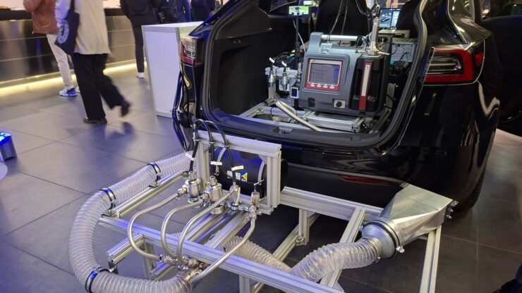 Il cuore del sistema Partenope è montato nella parte posteriore della Tesla Model Y, occupando l’intero spazio dell’abitacolo e del bagagliaio. Un lungo tubo con un bocchettone finale è posizionato vicino alla ruota destra, dove raccoglie le particelle di PM1, PM2.5 e PM10. Queste particelle vengono poi trasportate all’interno del sistema e misurate in tempo reale.